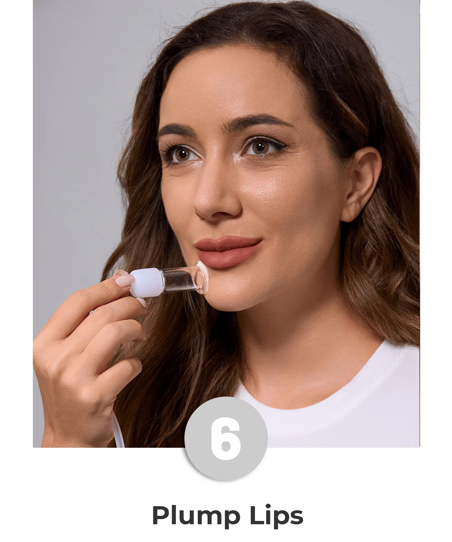 Use the small cup in Gua Sha mode along the lip line, moving from the outer edges to the center three times. Switch to cupping or massage mode and repeat three times. Do the same on the other side.